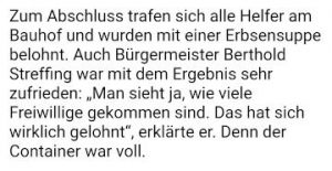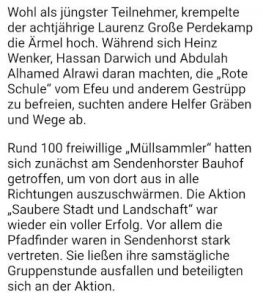 Entsprechend der Aufteilung der Arbeiten, die Willi Haubrock vorgenommen hatte, kümmerten sich Heinz Wenker, Hassan Darwich und Adulah Alhamed Alrawi um des Gestrüpp an der roten Schule aus Efeu und anderen Gewächsen, die anderen Aktiven wurden auf Gräben und Wege verteilt.
